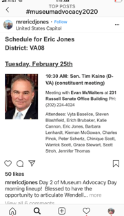 It's been a little over a week since my last post and I apologize for the gap! It's been a bit hectic here at the ranch last week. I do hope that you were able to follow the 2020 American Alliance of Museums Museum Advocacy Day (https://www.aam-us.org/programs/museums-advocacy-day/) here in Washington D.C. February 24th-25th! This event for those who don't know Advocacy Day (as described by AAM) is a unique opportunity to join with fellow museum professionals and supporters to make the case for museums to our representatives in Congress. Professionals from across the country come to lobby their state's congressman (or woman) to support policies that support museums and cultural institutions across the country.